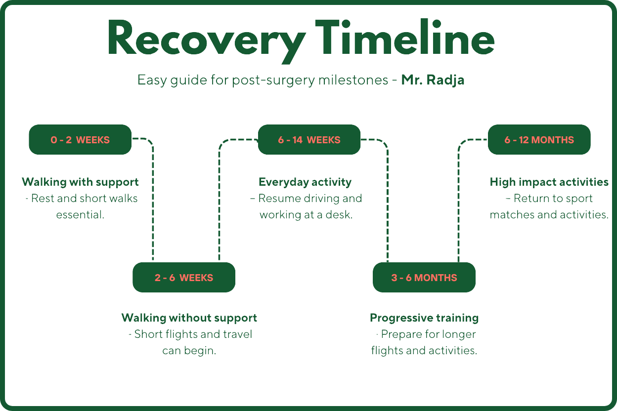 Re-rupture of the graft: This occurs in about 3–5% of patients. Mr. Radja will assess your knee and discuss further management if this happens.